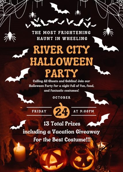 October 24 at 9 PM – River City Restaurant, 1400 Main St, Wheeling “The most frightening haunt in Wheeling: River City Halloween Party. Calling all ghosts and goblins! Join our Halloween Party for a night full of fun, food, and fantastic costumes! 13 total prizes including a vacation giveaway for the best costume!