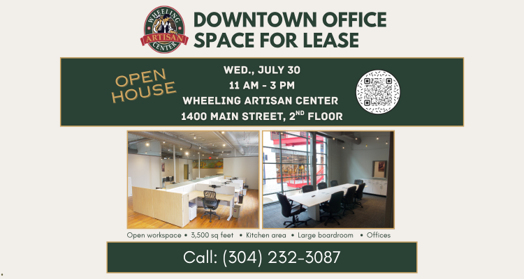 On Wednesday, July 30, Wheeling Heritage invites you to tour a spacious, second-floor office suite inside the historic Wheeling Artisan Center—a central location ideal for organizations looking to grow, collaborate, and plug into the energy of a revitalizing downtown.